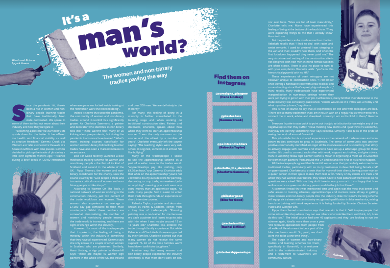 Since the pandemic hit, there’s been a rise in women and non-binary people in and around Govanhill learning trades that have traditionally been male dominated. For Issue 5 of the magazine, we spoke to some of these tradespeople to find out more about their industry, how they navigate it.
