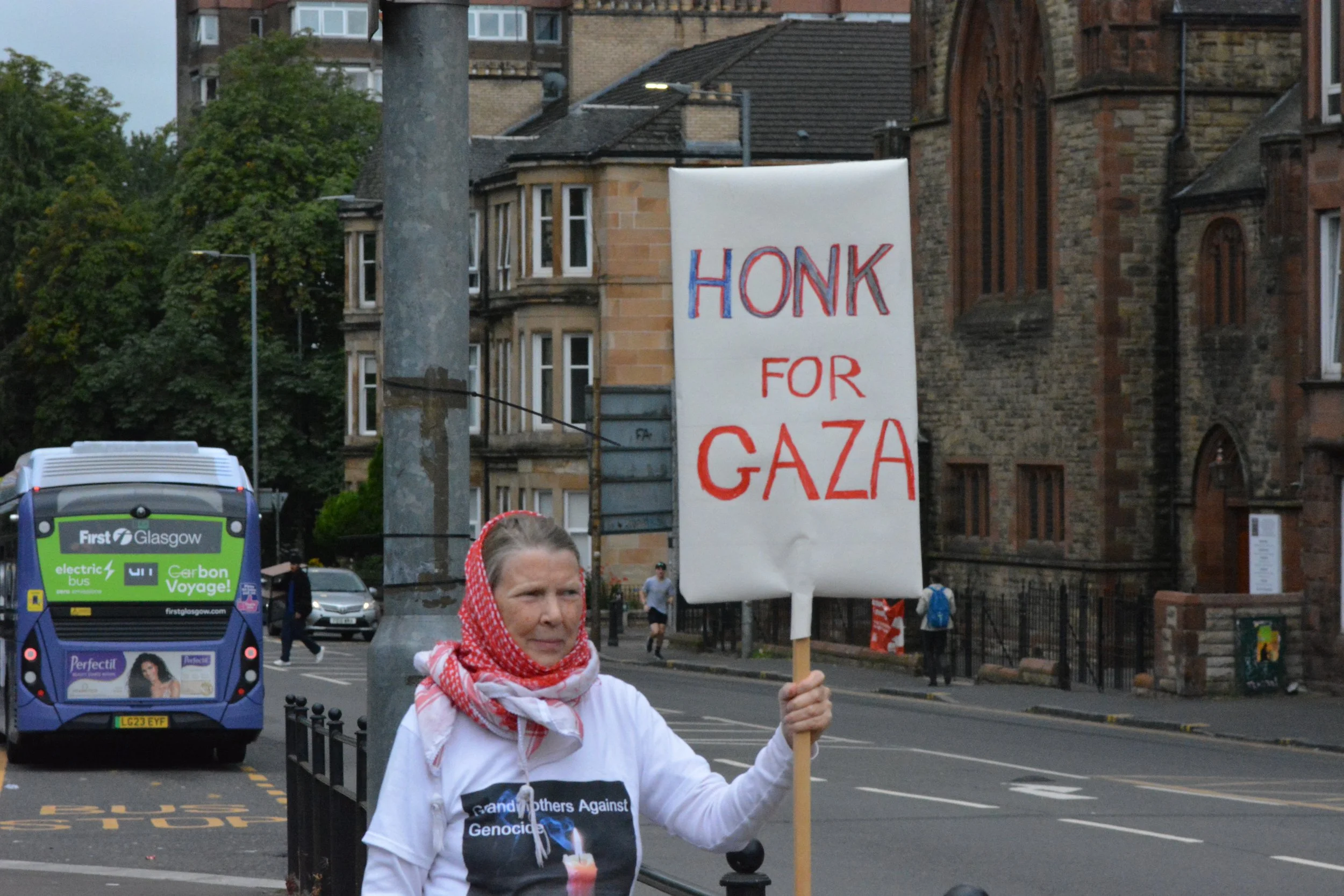 Demonstrator holds up ‘Honk for Gaza’ sign