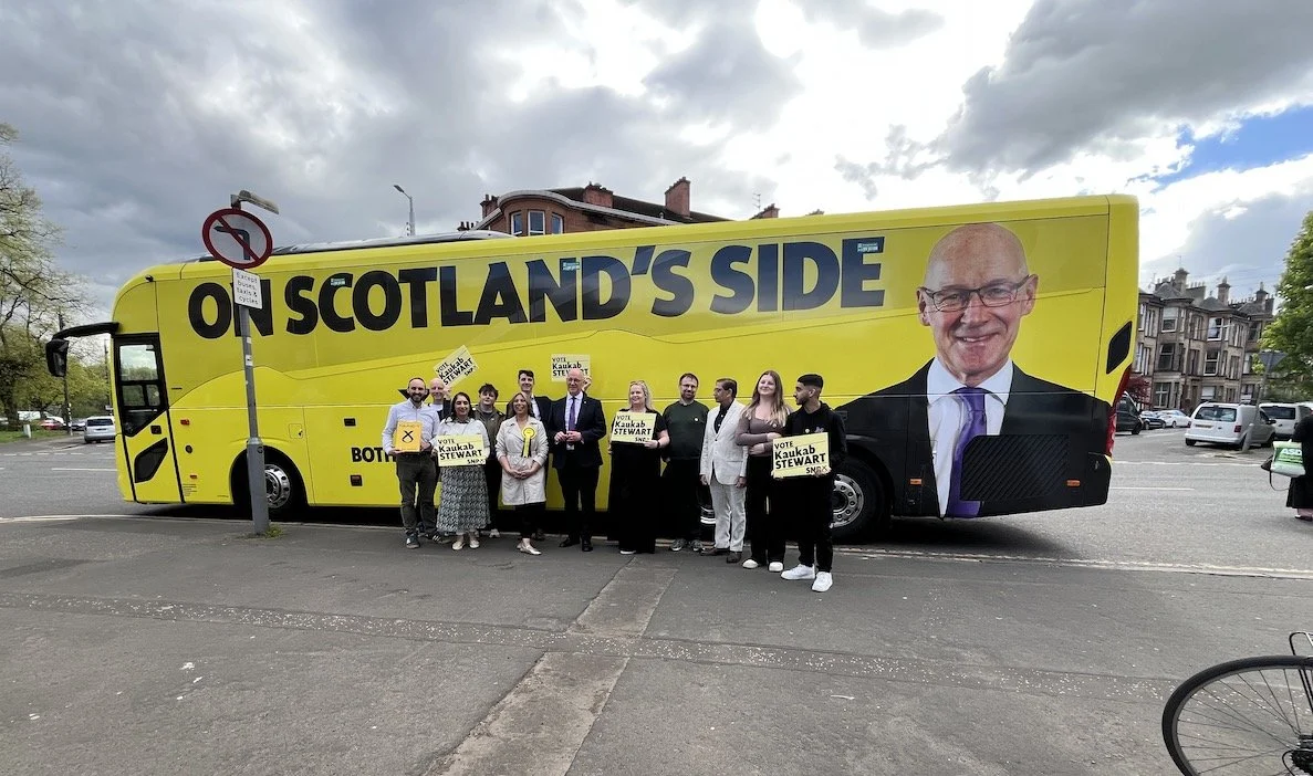 We had been offered a last minute interview with First Minister John Swinney, who was out on the campaign trail in a bright yellow bus emblazoned with his own face and the slogan ‘on Scotland’s side,’ together with Southside candidate Kaukab Stewart and party list candidate Declan Blench.