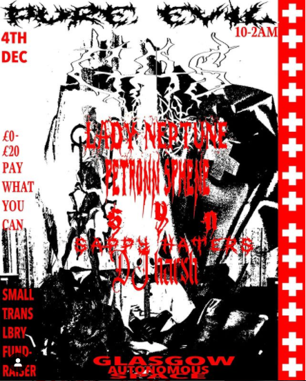 Join Southside’s trans and queer art collective The Feeling’s Mutual at Transmission for a night of dancing and fundraising. PURE EVIL is a pay what you can event that will be fundraising for the Small Trans Library.