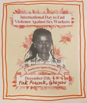 There will also be a short meeting on zoom from 6-7pm with speakers from ScotPEP discussing renewed efforts to increase client criminalisation in Scotland and how this will likely increase violence workers face, as well as guest speakers to talk about Agnes Wanjiru's story and the campaign for justice for her and her family.